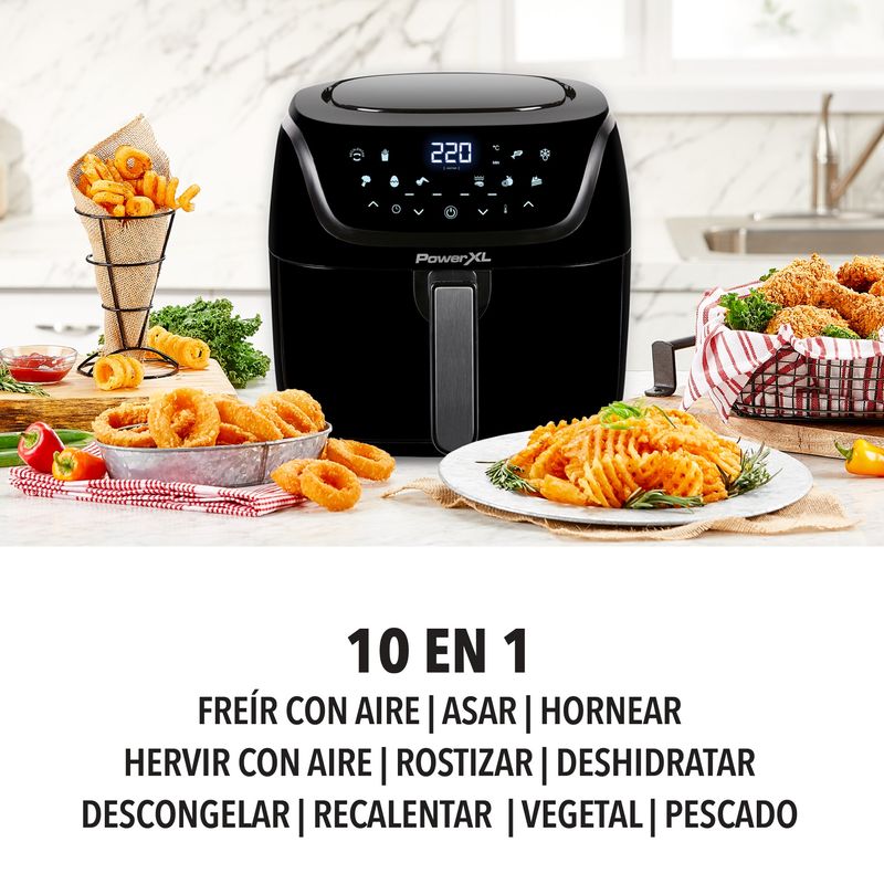Freidora de aire PowerXL™ Vortex con doble cesta DUAF-10-LA. Cocina 2 alimentos diferentes al mismo tiempo, tiene dos cestas de 4.7 litros de capacidad cada una o prepara un alimento extra grande en una sola cesta de 9.5 litros. La freidora de aire PowerXL™ tiene pantalla led digital y táctil con 8 funciones automáticas: freír con aire, dorar, hervir con aire, rostizar, hornear, asar, deshidratar y recalentar. La freidora de aire PowerXL™ cuenta con tecnología Vortex, optimizando el flujo de aire en forma de vórtice, para freír con aire hasta un 80% menos calorías sin grasa vs cocinar papas fritas congeladas en una freidora convencional, para un sabor crujiente sin culpa. La freidora de aire PowerXL™ tiene la función SmartSync para cocinar 2 alimentos a la vez y terminar al mismo tiempo, este sistema dual cuenta con un solo ventilador. Sus piezas son removibles y aptas para lavavajillas. Cuenta con 1 año de garantía.