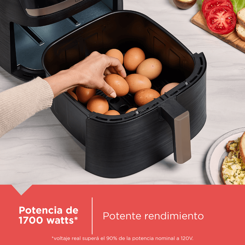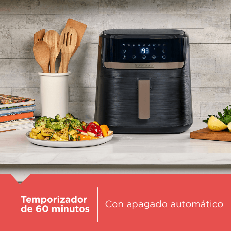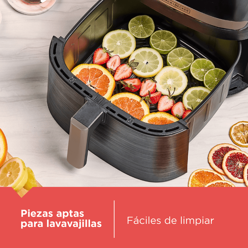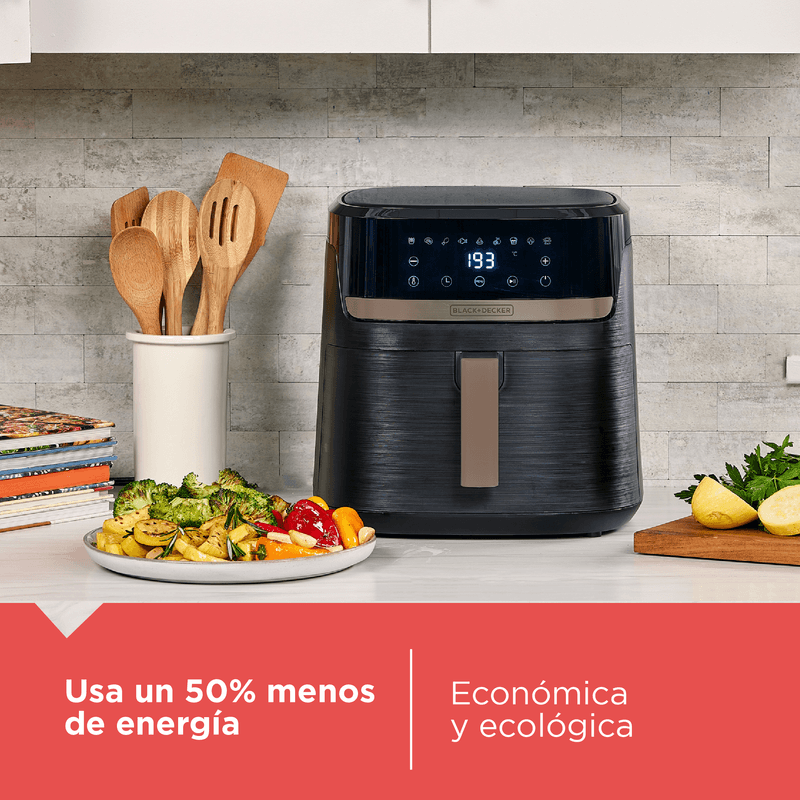 La freidora de aire Purifry Black+Decker combina tecnología Airfry con diseño elegante en negro y champagne. Con 9 funciones preprogramadas y pantalla táctil digital, cocina 2 veces más rápido usando 50% menos de energía. Su cesta antiadherente es fácil de limpiar y apta para lavavajillas. Ideal para disfrutar comidas crujientes sin remordimientos, ahorrando tiempo y esfuerzo.