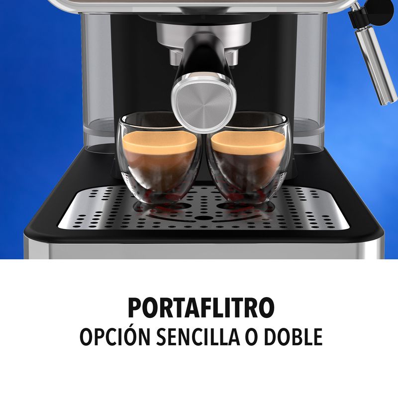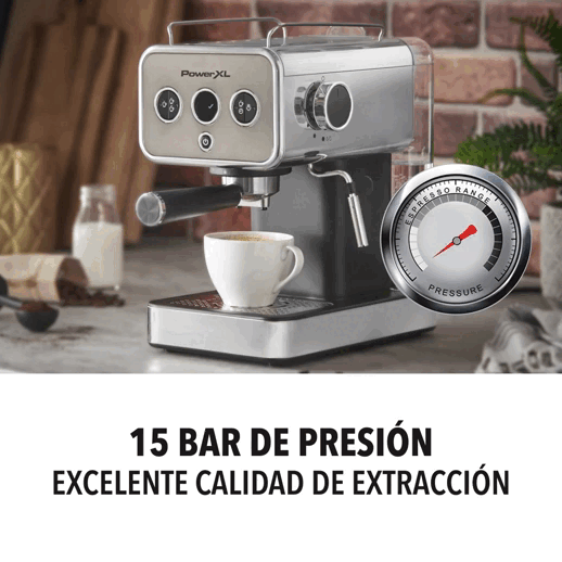 Maquina para Espresso Semi-automática PowerXL™ Distinctions , te ofrece una excelente calidad de extraccion para un sabor autentico. Disfruta de un café espresso de alta calidad, sueve, sedoso, preparado en cada gracias a una impresionante bomba de 15 bar y una potente varilla de vapor que crea fácilmente una espuma suave o dispensa agua caliente para café americano y chocolate caliente.